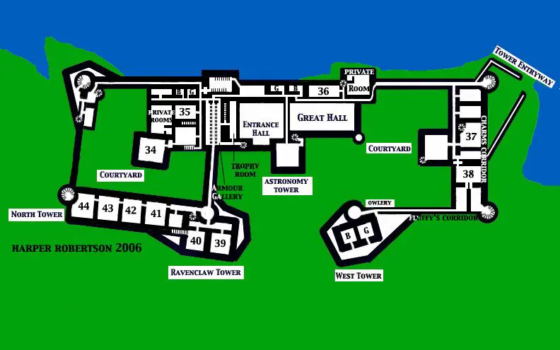 DUMBLEDORE: The third floor corridor – this one, that passes along the west side of the courtyard to the owlery. Directly beneath that lies this first chamber. I wonder –
